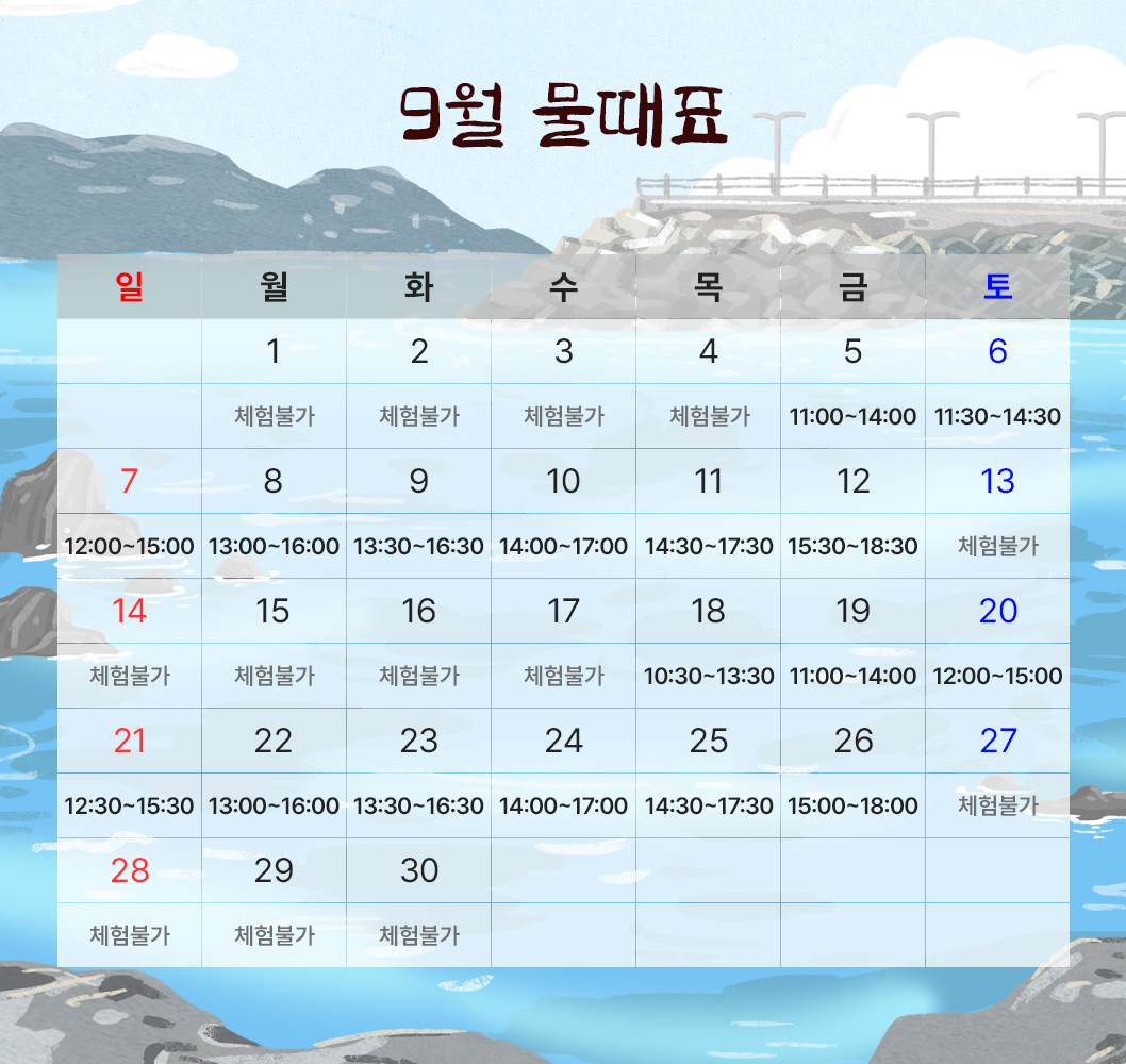 체험시간 9월 물때표 꽃내갯벌체험장 2025. 8. 27. 23:34 공유하기 게시글 관리 꽃내갯벌체험장 '체험시간' 카테고리의 다른 글 11월 물때표 (0) 2025.10.27 10월 물때표 (8) 2025.09.17 8월 물때표 (7) 2025.08.01 7월 물때표 (0) 2025.07.01 입장료 (0) 2025.06.03 '체험시간' Related Articles 11월 물때표 10월 물때표 8월 물때표 7월 물때표